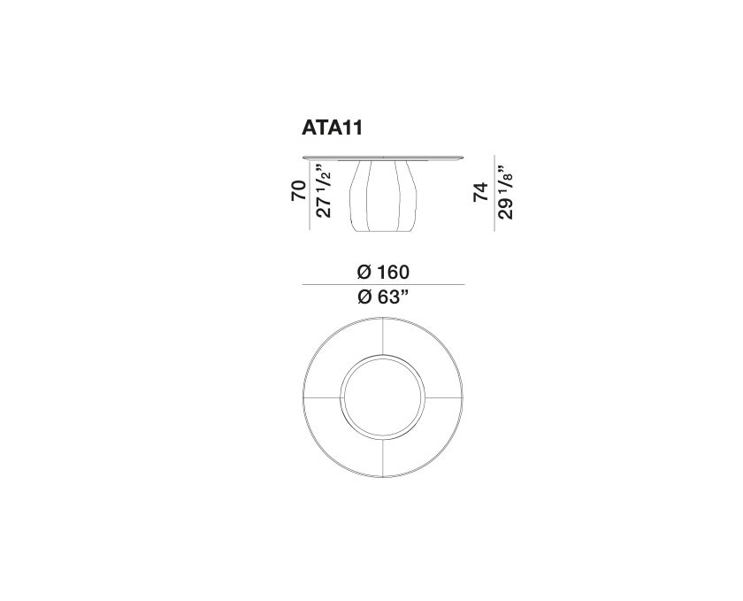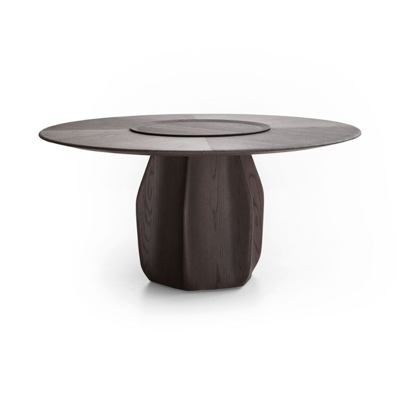 Le plateau 160 cm, au chant arrondi dans la version en essence est subdivisé en quatre épis qui créent un dessin géométrique intéressant. La table est dotée en outre d’un accessoire pratique : un plateau pivotant central (Lazy Susan), très apprécié dans les pays asiatiques.