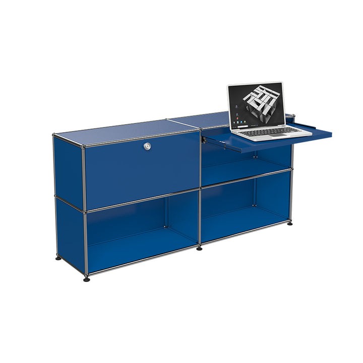 Bureau composé de 4 modules dont 2 ouverts, 1 équipé d’une porte abattante (poignée sans serrure) et 1 équipé d’une tablette.