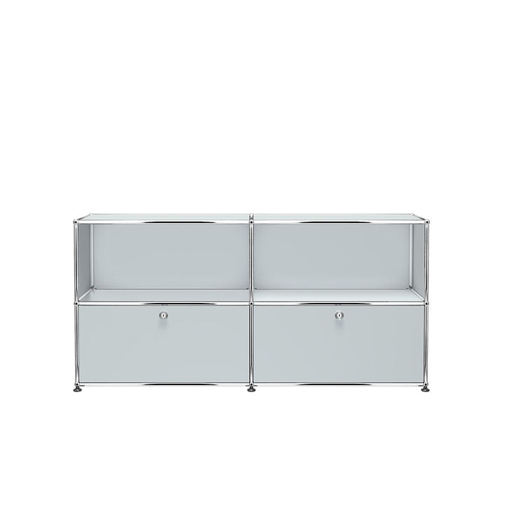Meuble de rangement composé de 4 modules dont 2 ouverts et 2 équipés de portes abattantes (poignées sans serrure).