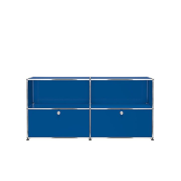 Meuble de rangement composé de 4 modules dont 2 ouverts et 2 équipés de portes abattantes (poignées sans serrure).