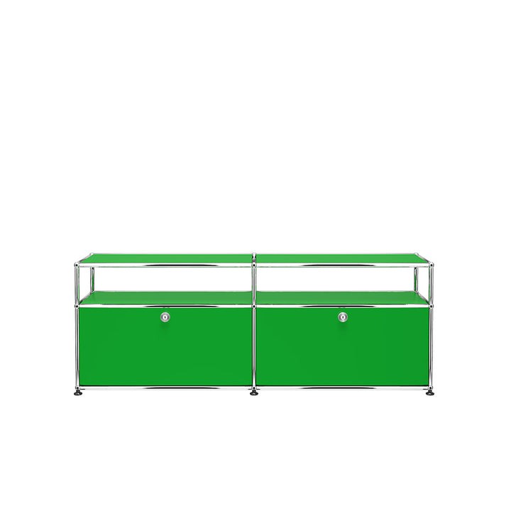 Meuble bas composé de 4 modules dont 2 ouverts et 2 équipés de portes abattantes (poignées sans serrure).