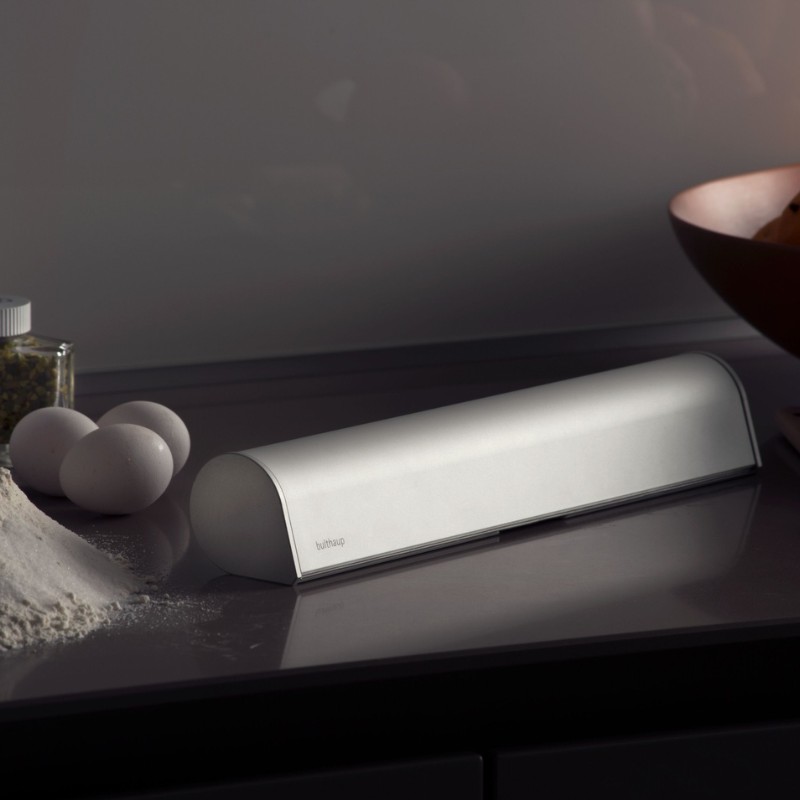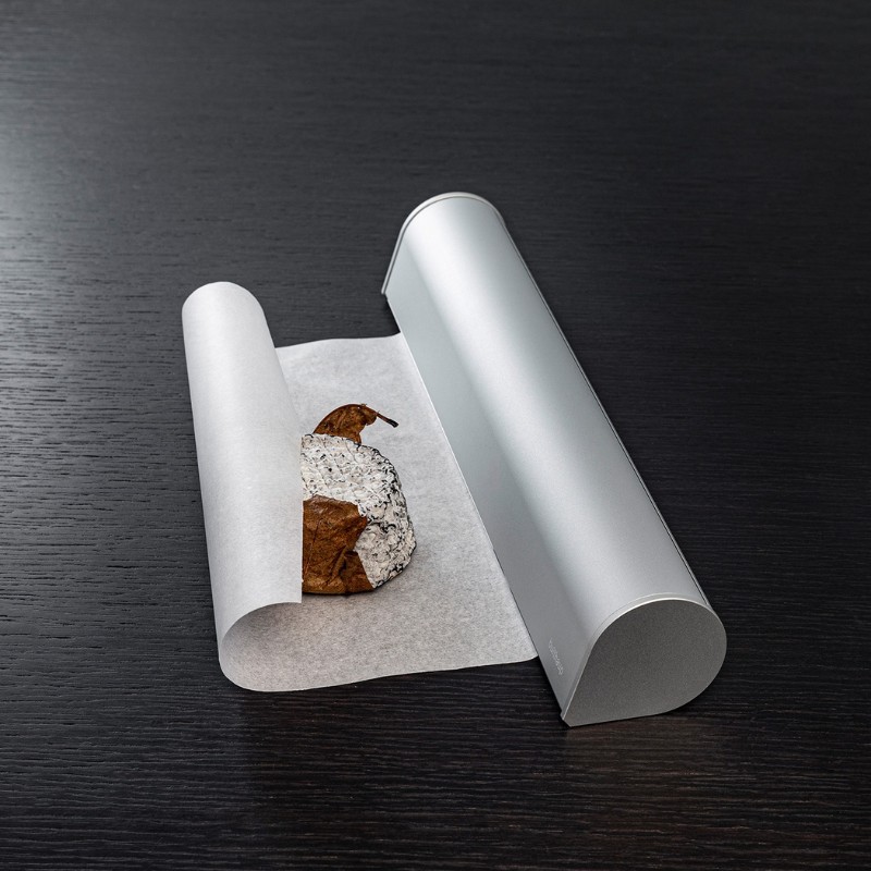 Le dérouleur de film en aluminium permet, grâce aux fines dents de sa lame de découpe, de séparer les feuilles de façon propre et sans déchirure. La forme cylindrique du dérouleur est adaptée à la main humaine. Inutilisé, il se range dans le tiroir pour économiser de la place et rester à portée de main.