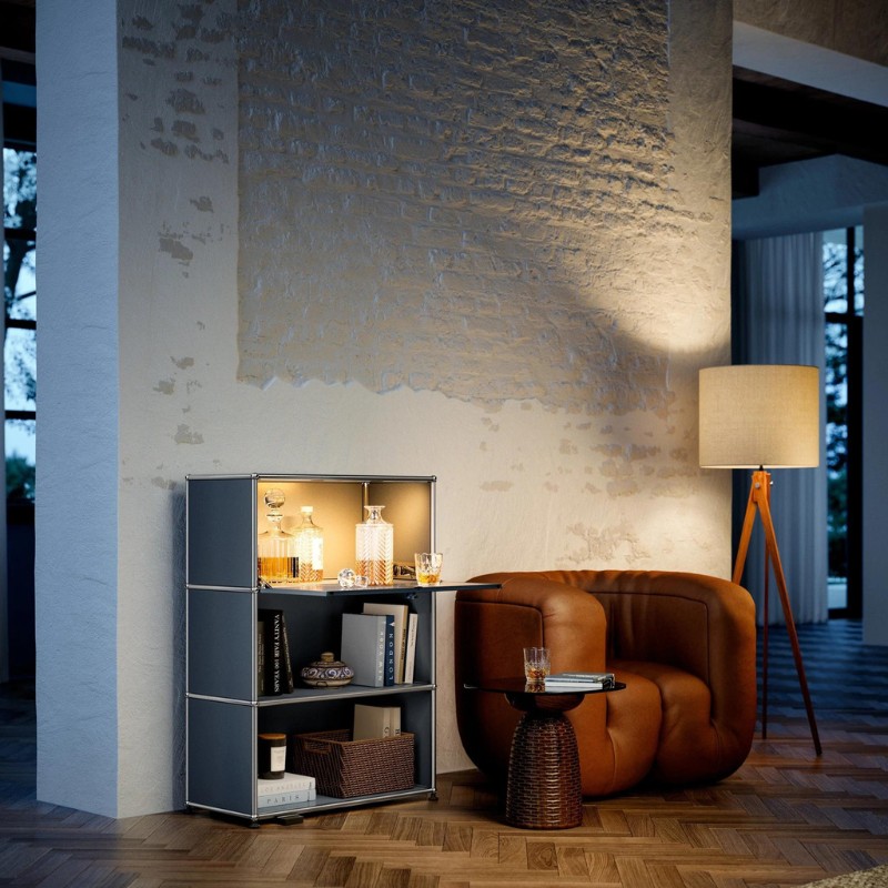 Le nouveau système d’alimentation et d’éclairage intégré USM Haller E révèle les meubles sous un nouveau jour ! Révolutionnaire, l’alimentation est entièrement sans fil. L’électricité est transportée jusqu’aux emplacements souhaités via la structure portante du meuble.