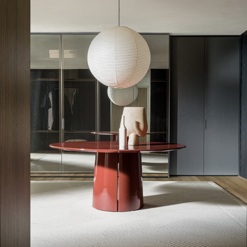 La table est juchée sur une base incurvée qui s'évase très légèrement en descendant, assurant stabilité et solidité tout en apportant une touche d'inattendu. La base conique est disponible en une version ronde et une version ovale afin de s'intégrer sans discontinuité dans les espaces existants.