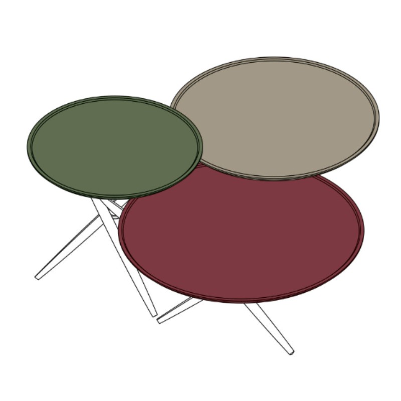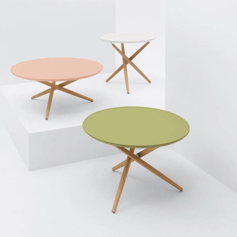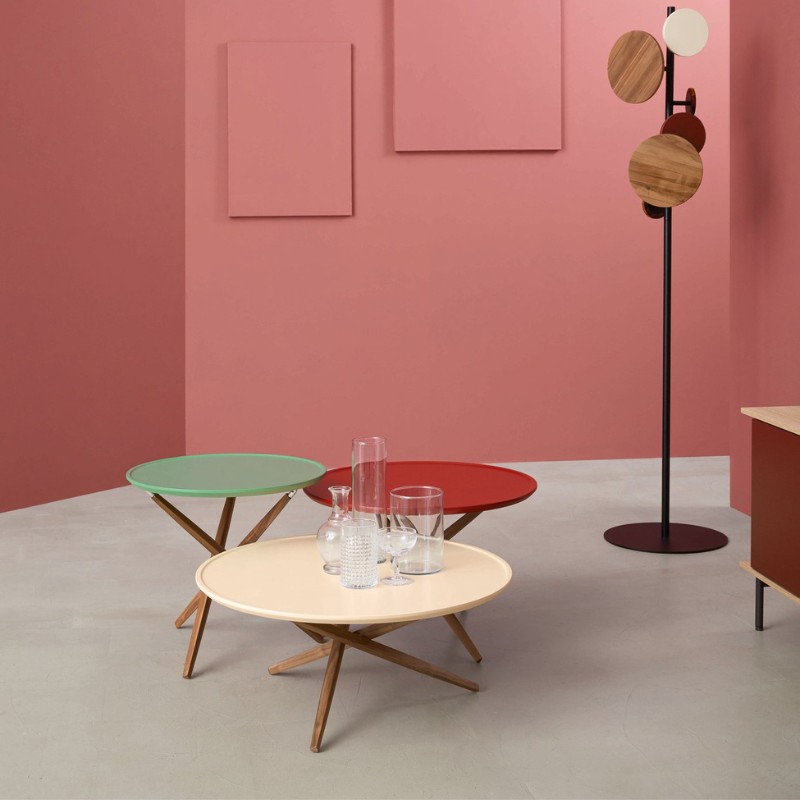 Les formes géométriques jouent avec l’espace en mouvement, accueillent, se font écho entre elles et interagissent avec ce qui les entoure. Le triangle soutient le cercle grâce à l’élégant croisement des pieds donnant une unité harmonieuse à l’ensemble des petites tables Pico.