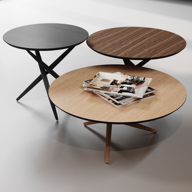 3 tables basses avec piètement croisé en bois massif. Le plateau rond est réalisé en CDF (Compact Density Fiber) avec le chant toujours noir. Disponible en Placage (bois) V16 chêne, V18 chêne teinté anthracite ou V19 noyer américain. Les pieds ont la même finition du plateau. Les plateaux sont de diamètres, 50, 60 et 70 cm.