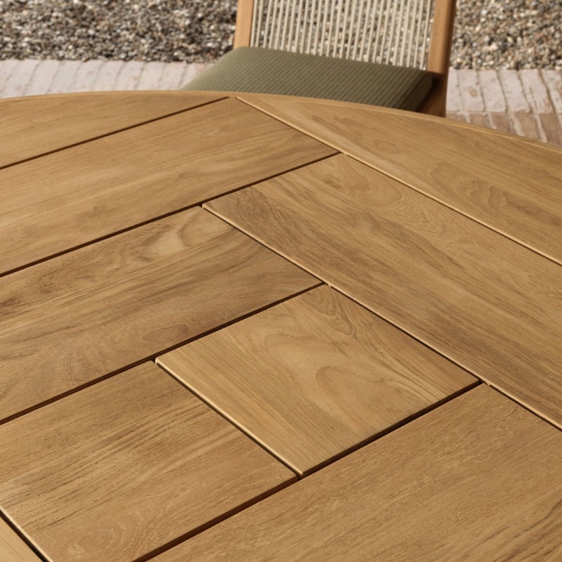 Top et pieds en teck massif avec finition naturelle, patins réglables en matière plastique.